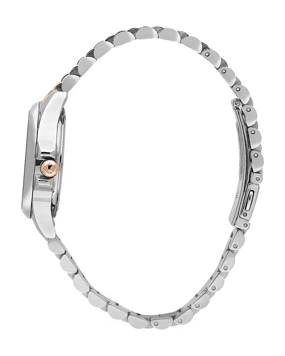 Η κάσα 32 mm από ανοξείδωτο ατσάλι με γυαλιστερό φινίρισμα (Lucido) και η δίχρωμη σχεδίαση σε ασημί και ροζ χρυσό προσδίδουν στο ρολόι μία πολυτελή αλλά και διακριτική εμφάνιση. Το μεταλλικό μπρασελέ σε ροζ χρυσή απόχρωση και το κούμπωμα τύπου deployant με push buttons προσφέρουν άνεση και ασφάλεια, διατηρώντας παράλληλα μια εκλεπτυσμένη αισθητική.